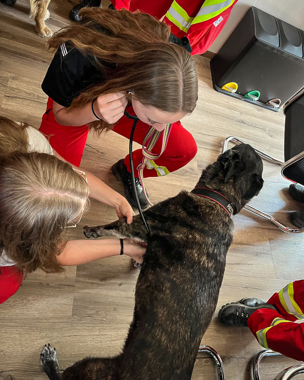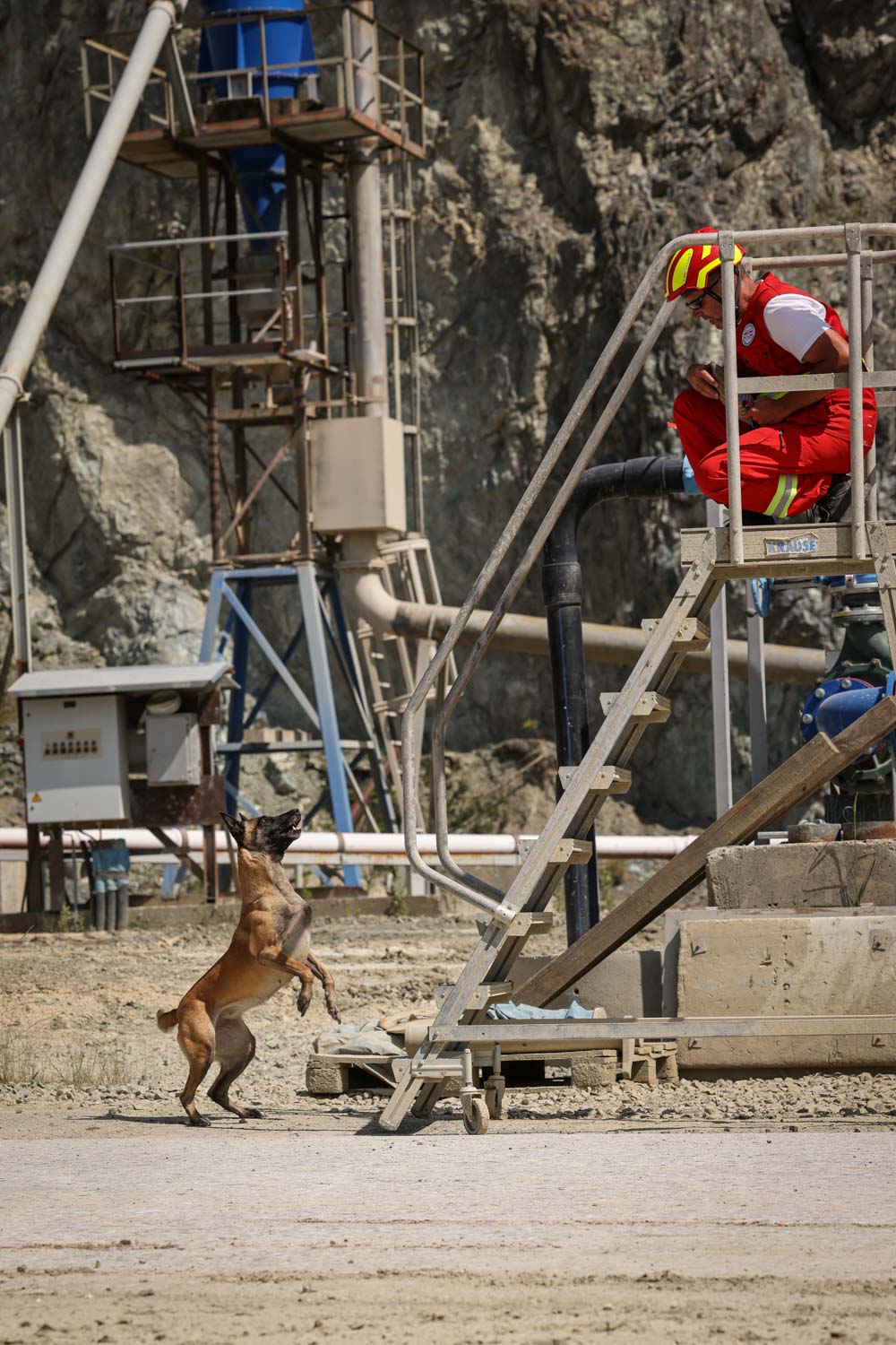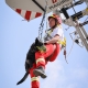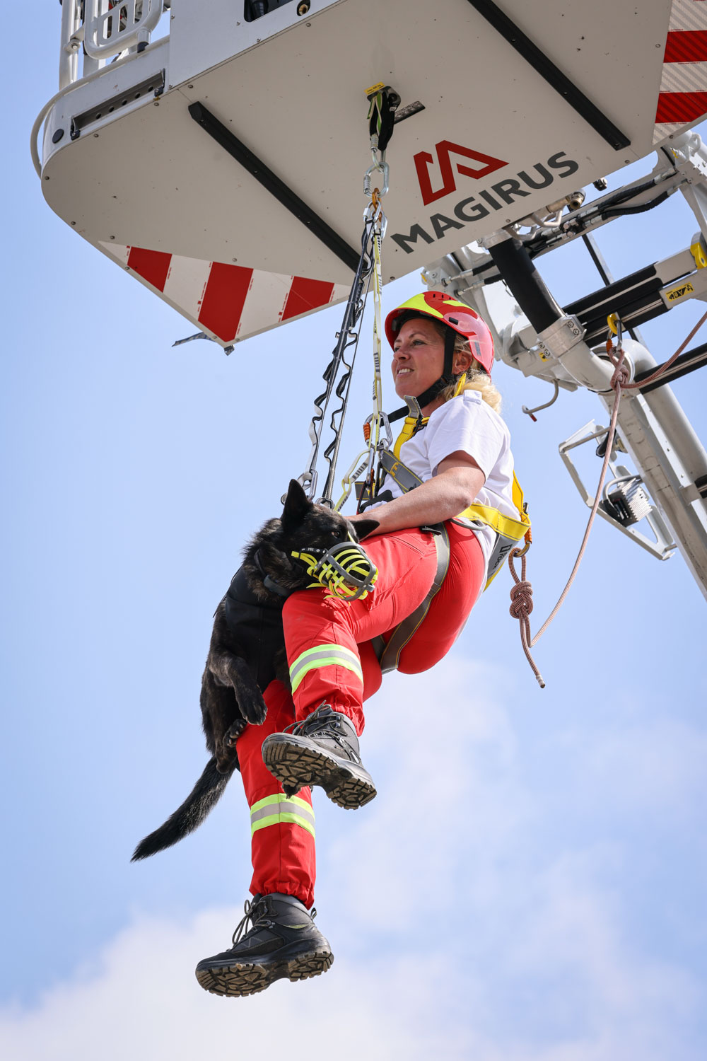 Am Gelände der Betriebsfeuerwehr der voestalpine konnte das Abseilen mit den Hunden am Ausleger des Feuerwehrkrans geübt werden. Selbstverständlich erhielten die Teilnehmer:innen eine ausführliche Sicherheitseinschulung, bevor es hoch hinaus ging und spektakuläre Erinnerungen möglich gemacht wurden.