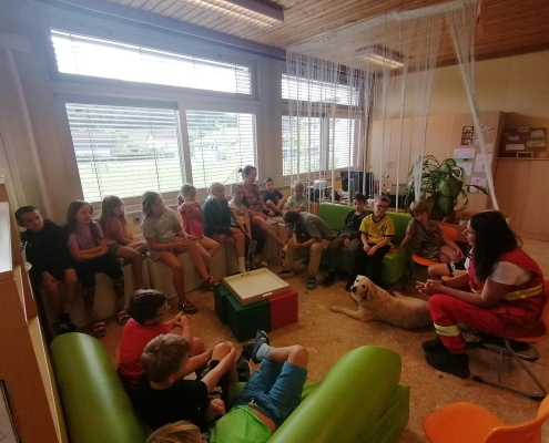 Robert Krebs von der Staffel Glantal besuchte mit seiner Kira den Hort St. Kanzian. Spielerisch brachte er den Kindern die Rettungshundearbeit näher, die Streicheleinheiten für Rettungshündin Kira durften dabei natürlich nicht fehlen.
