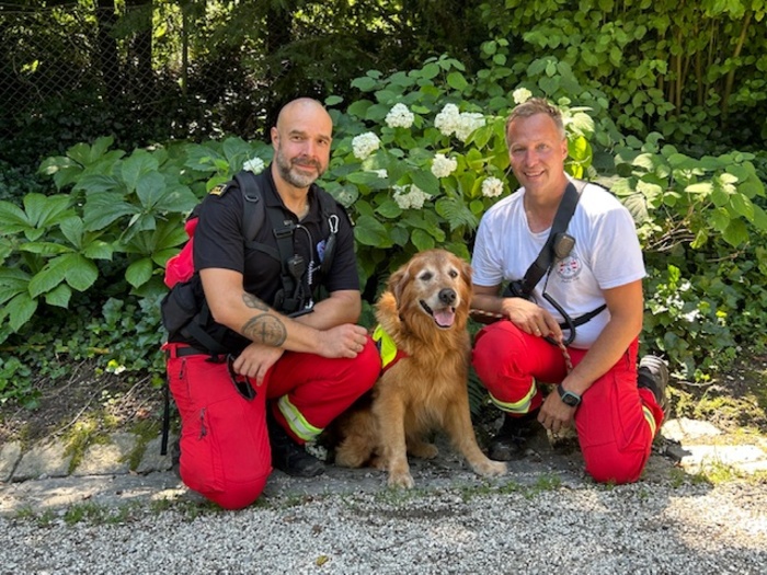 Auch das Team rund um Hundeführer Wolfgang Eibl mit Rettungshund Findus und Suchtruppführer Thomas Ehrengruber begab sich ins sehr steile Gelände – bei extrem heißen Temperaturen . Mit viel Einsatz und Ausdauer durchsuchten sie ihr zugeteiltes Gebiet sorgfältig.