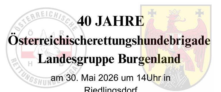 Die 40 – Jahr Feier der Österreichischen Rettungshundebrigade Landesgruppe Burgenland findet am 30. Mai 2026 um 14Uhr in Riedlingsdorf statt.