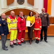 Aus diesem besonderen Anlass würdigte der Landtag Burgenland gestern, am Donnerstag, dem 4. Dezember 2025, das vielfältige Engagement der Rettungs-, Hilfs- und Einsatzorganisationen aus dem Bezirk Oberwart. Auch VertreterInnen der Österreichischen Rettungshundebrigade folgten der Einladung in das Landhaus Alt, wo sie um 17:00 Uhr von Frau Landtagspräsidentin Mag. Astrid Eisenkopf offiziell empfangen wurden.