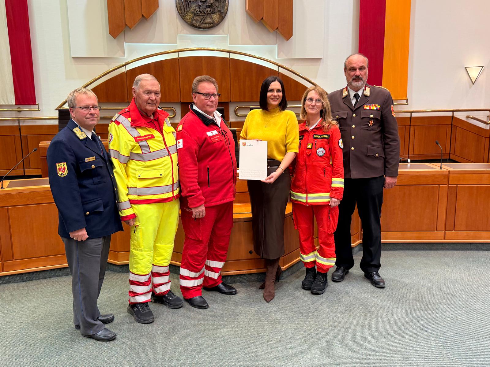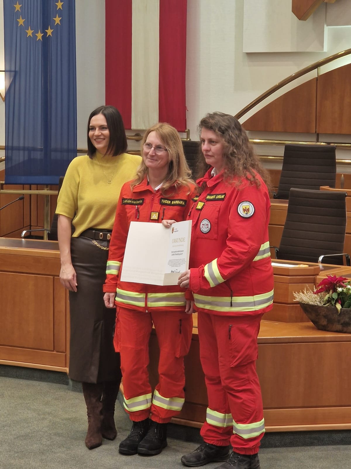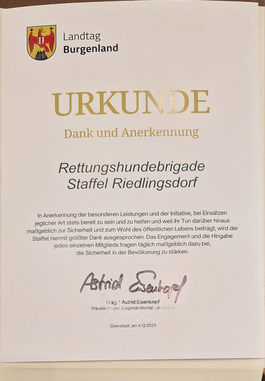 Aus diesem besonderen Anlass würdigte der Landtag Burgenland gestern, am Donnerstag, dem 4. Dezember 2025, das vielfältige Engagement der Rettungs-, Hilfs- und Einsatzorganisationen aus dem Bezirk Oberwart. Auch VertreterInnen der Österreichischen Rettungshundebrigade folgten der Einladung in das Landhaus Alt, wo sie um 17:00 Uhr von Frau Landtagspräsidentin Mag. Astrid Eisenkopf offiziell empfangen wurden.